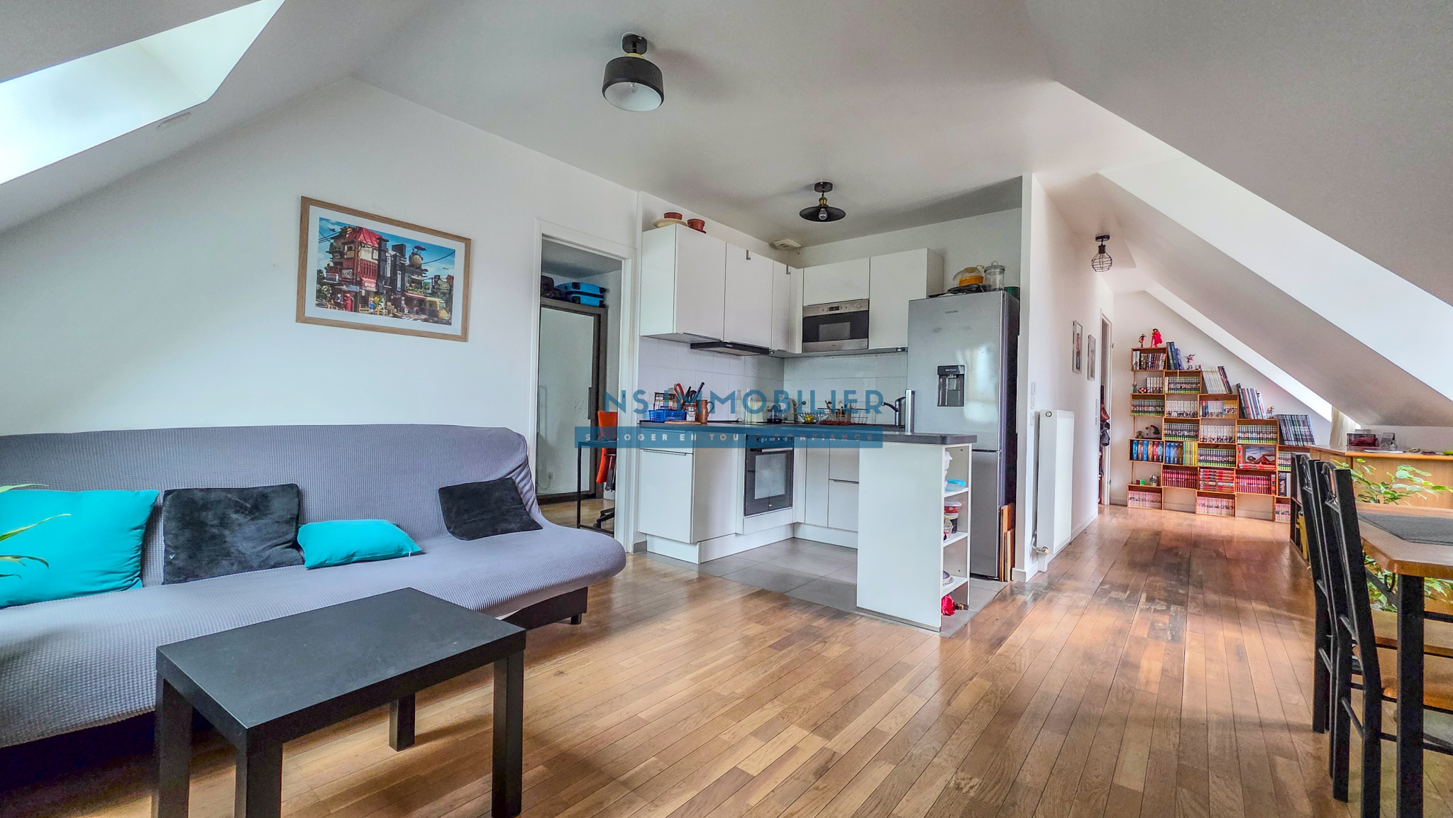 Une entrée avec placard, un spacieux séjour donnant sur une vue dégagée, une cuisine aménagée et équipée ouverte, une chambre avec dressing et coin bureau et une salle d'eau avec WC,