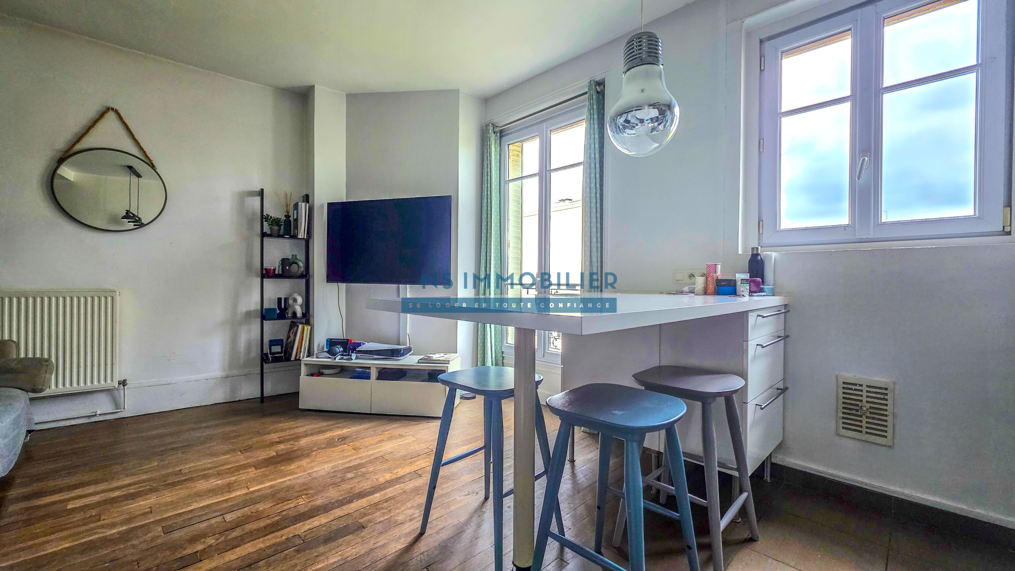 Une entrée avec placard, un spacieux séjour, une cuisine aménagée et équipée ouverte, un coin bureau, deux chambres d'env. 12m², une salle d'eau et WC séparé.