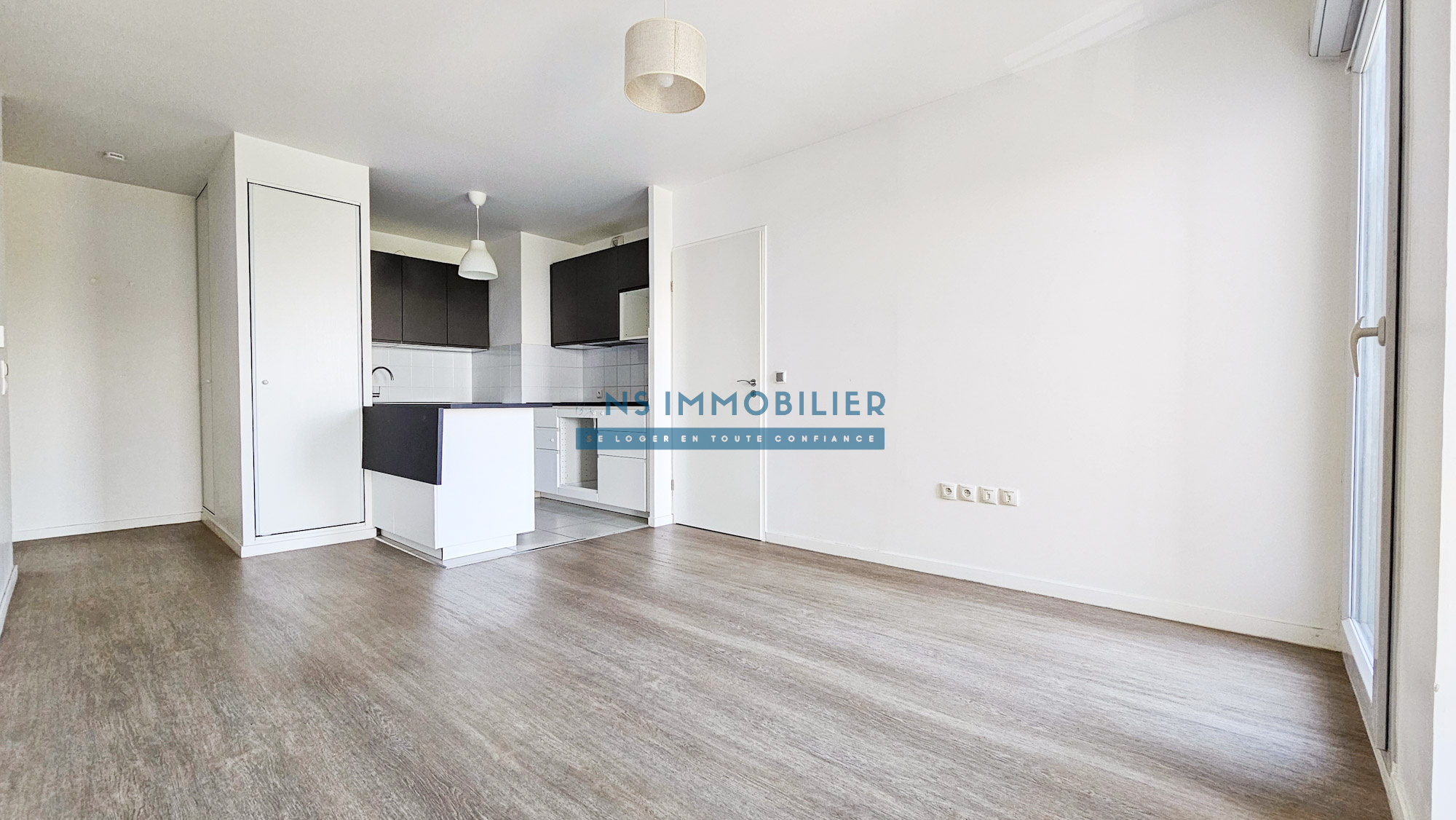 Une entrée avec placard, un spacieux séjour donnant sur sa terrasse, une cuisine aménagée et équipée, une chambre (accès terrasse), une salle d'eau avec WC.