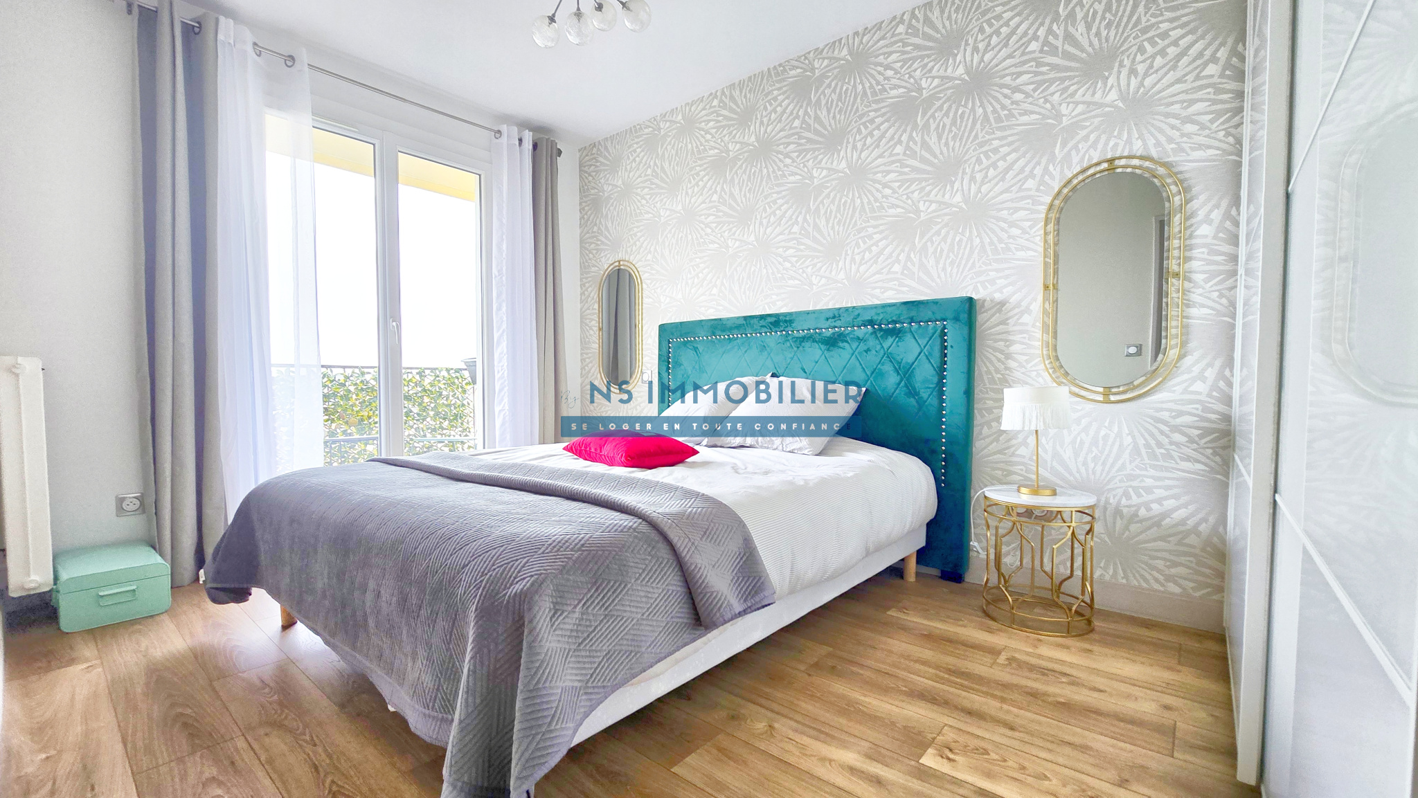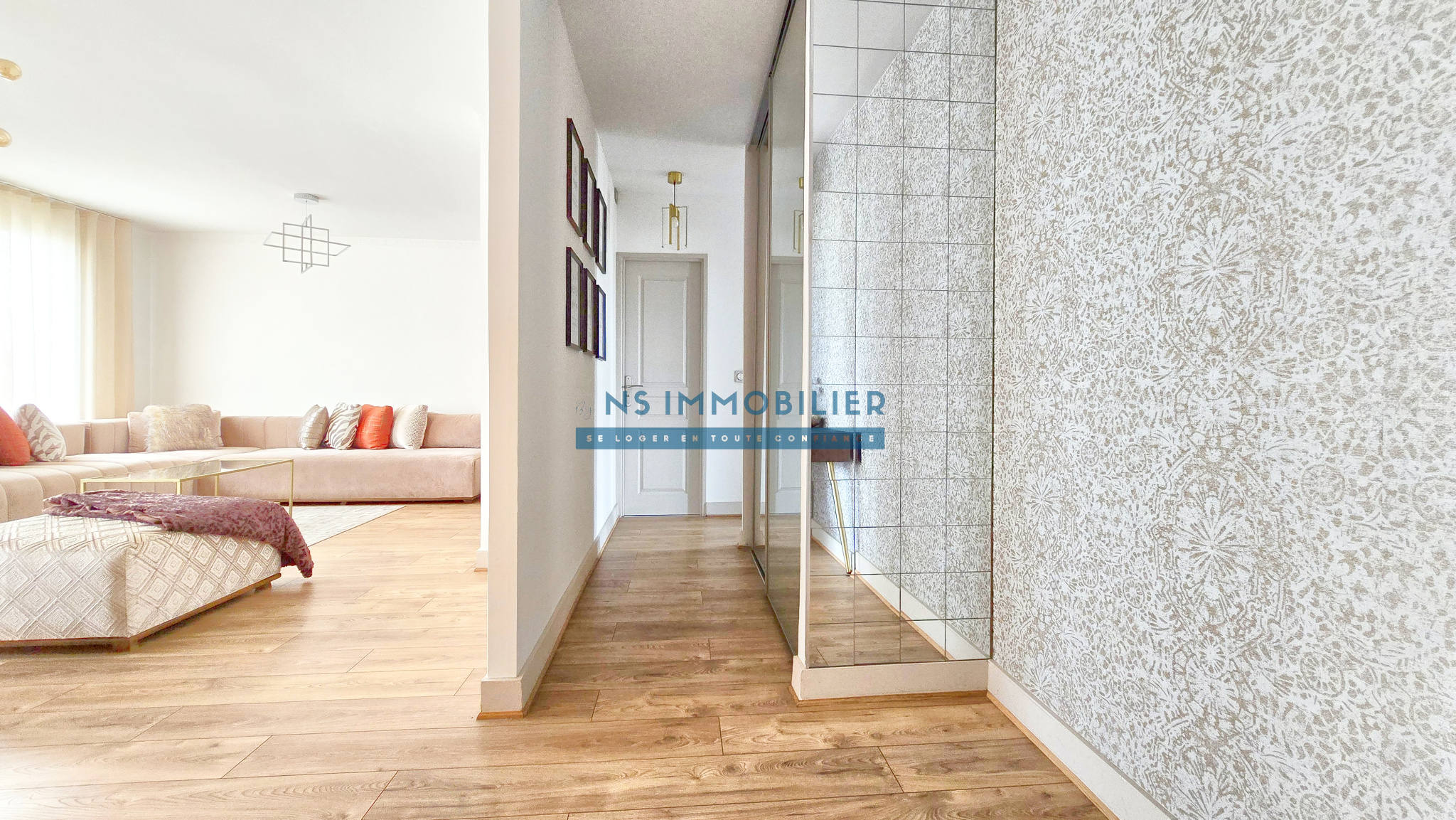 Une entrée avec placard, un double séjour, une cuisine aménagée et équipée indépendante avec balcon, deux chambres dont une avec dressing et balcon, une salle d'eau et un WC séparé,