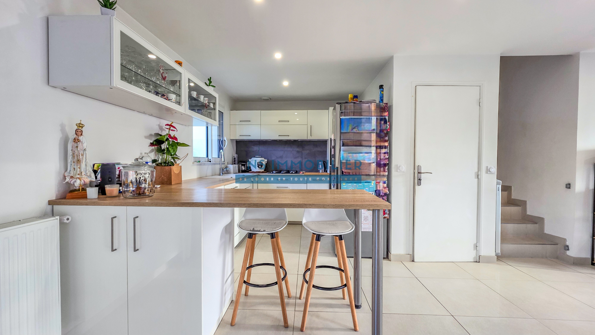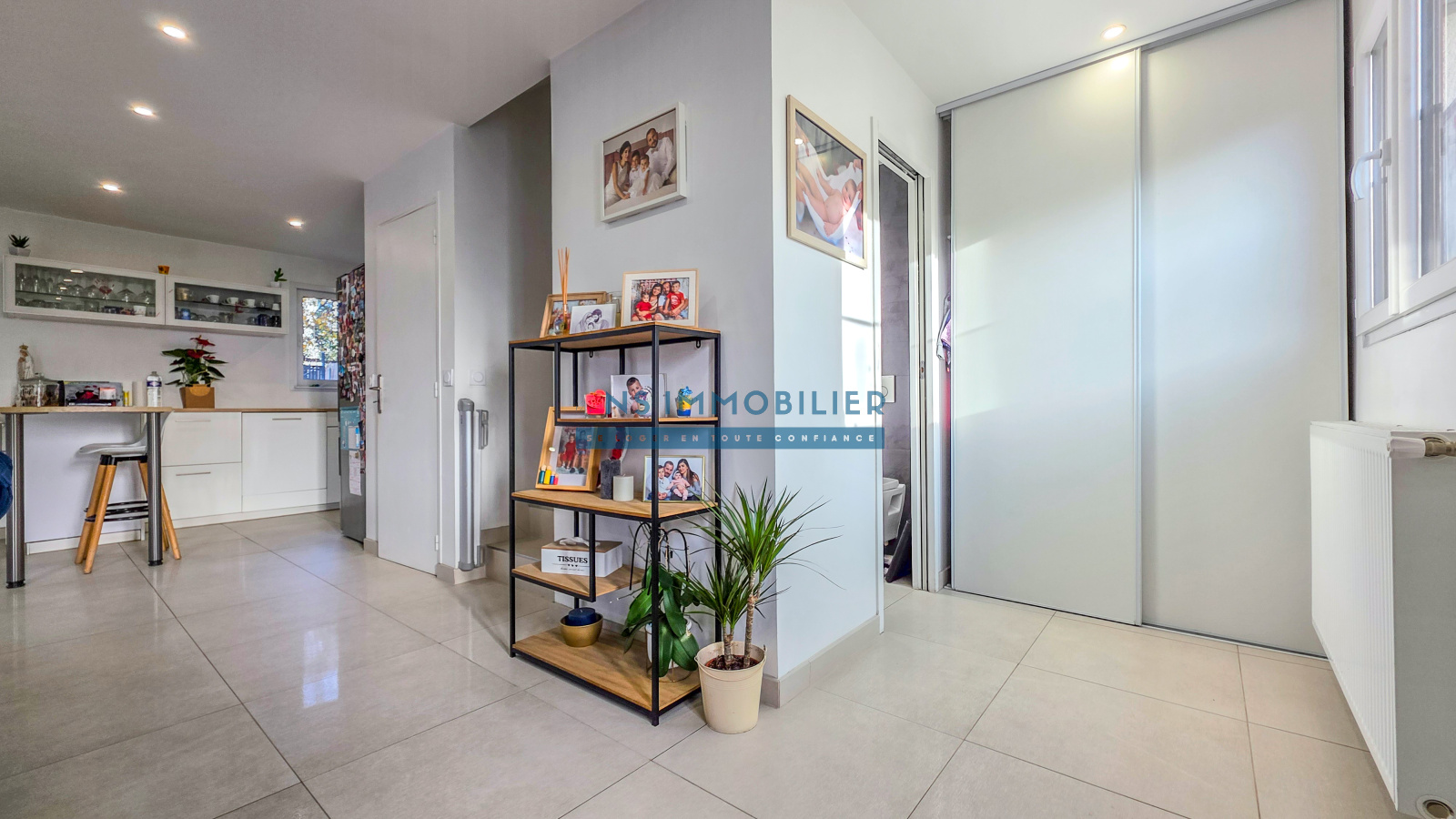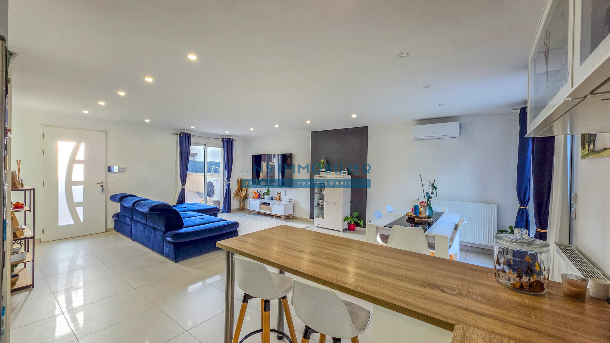 Une entrée avec un spacieux séjour/salle à manger donnant sur sa terrasse et son jardin, une cuisine aménagée et équipée ouverte, un WC séparé.