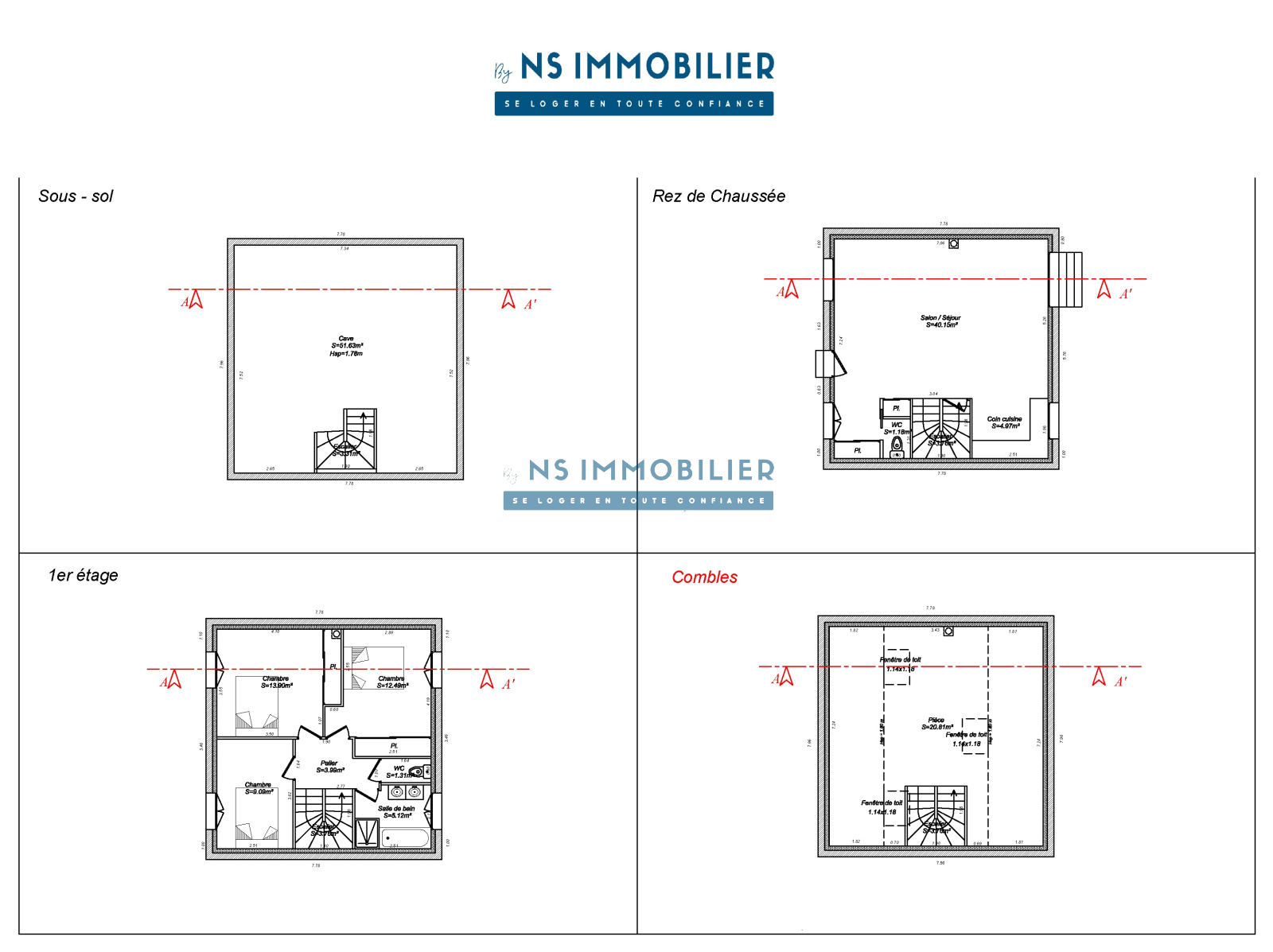 À l'étage : trois chambres dont 2 avec dressing (env. 14 ; 13 et 10m²), une salle de bain avec douche et un WC indépendant,