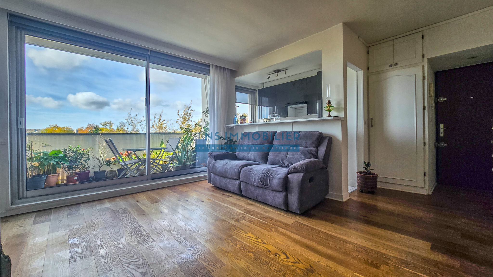 Une entrée avec placard, un spacieux séjour, une cuisine semi-ouverte aménagée et équipée, une salle à manger (possibilité d'une chambre), une chambre avec dressing, une salle d'eau et un WC séparé,