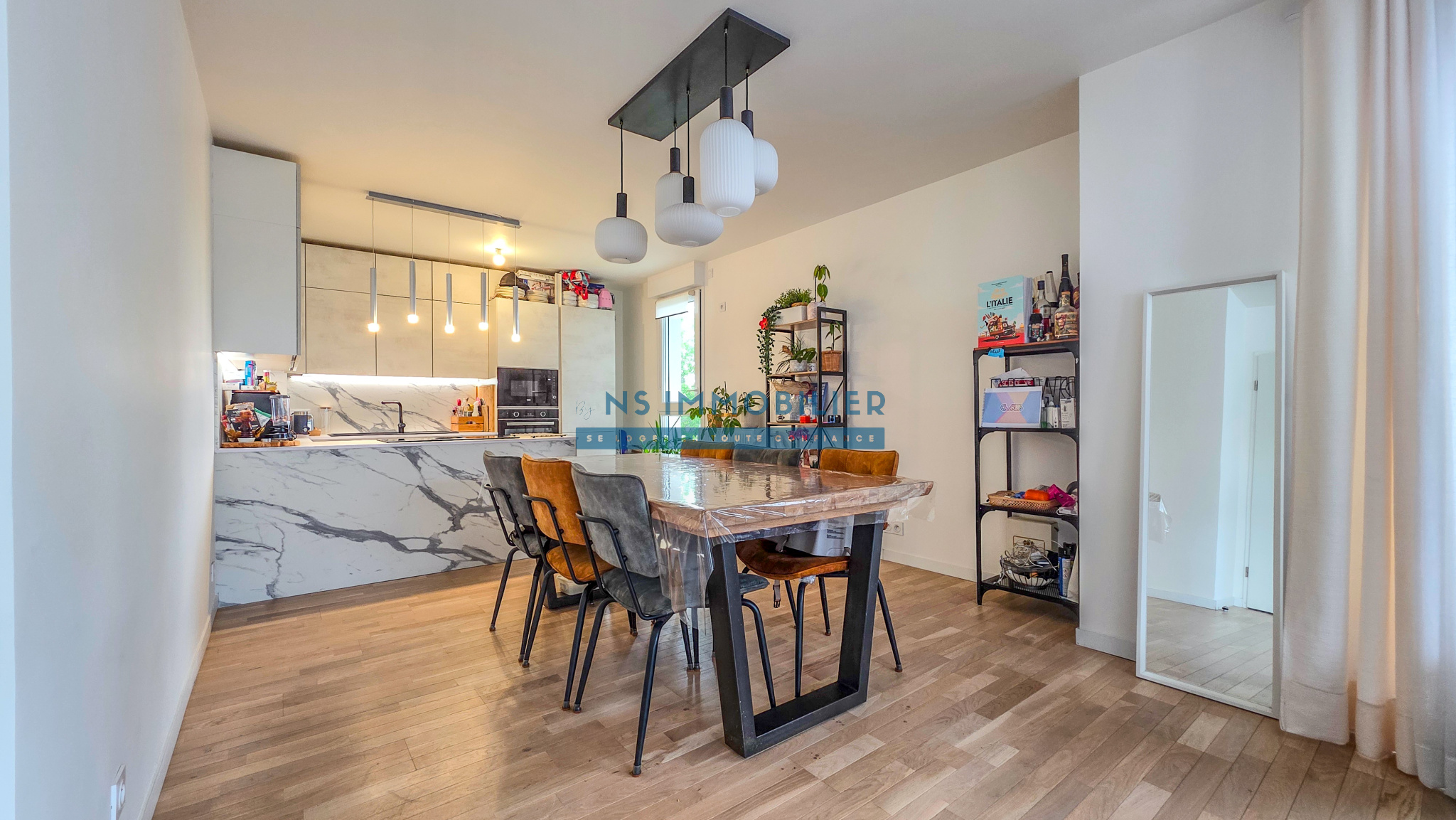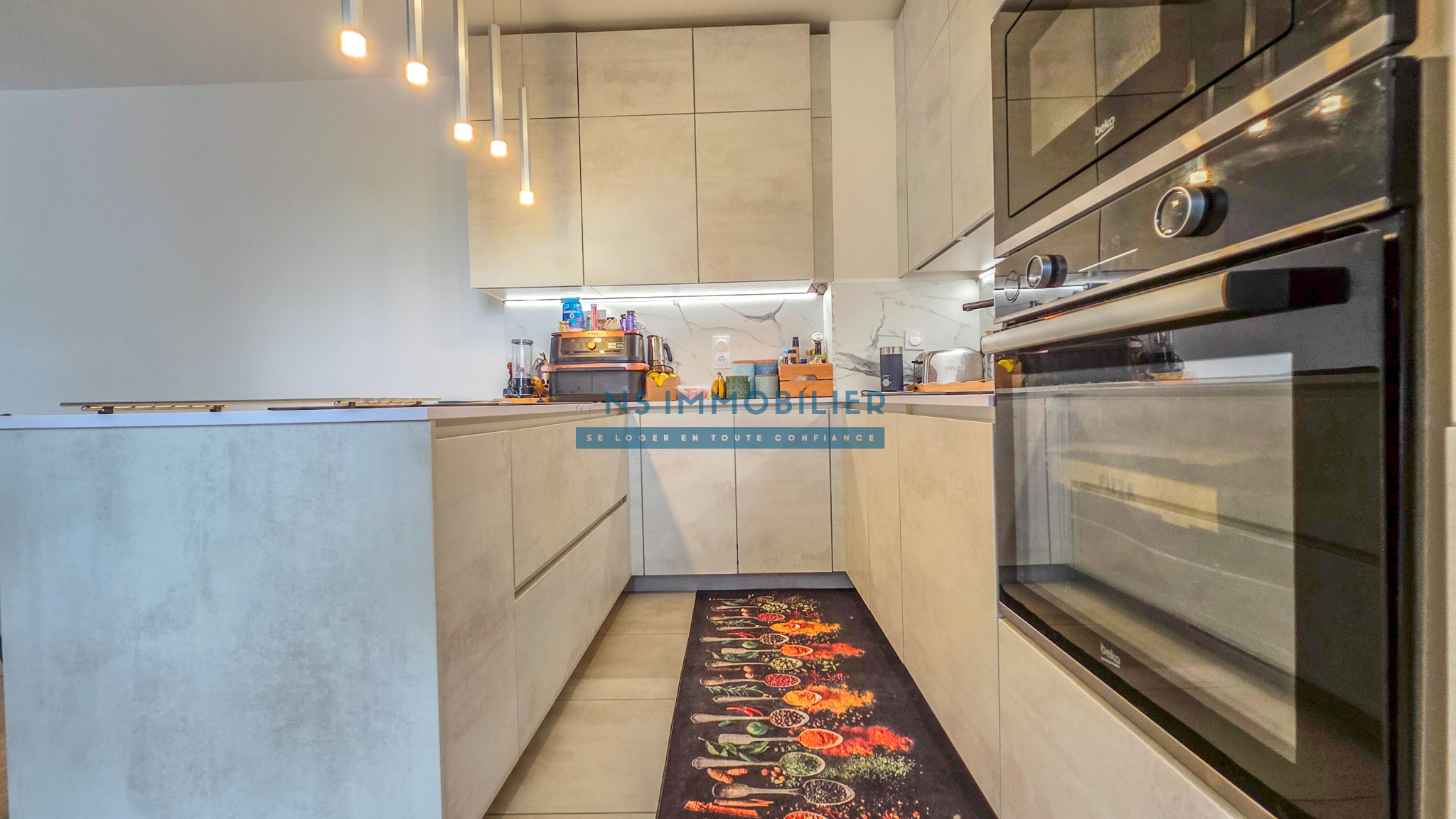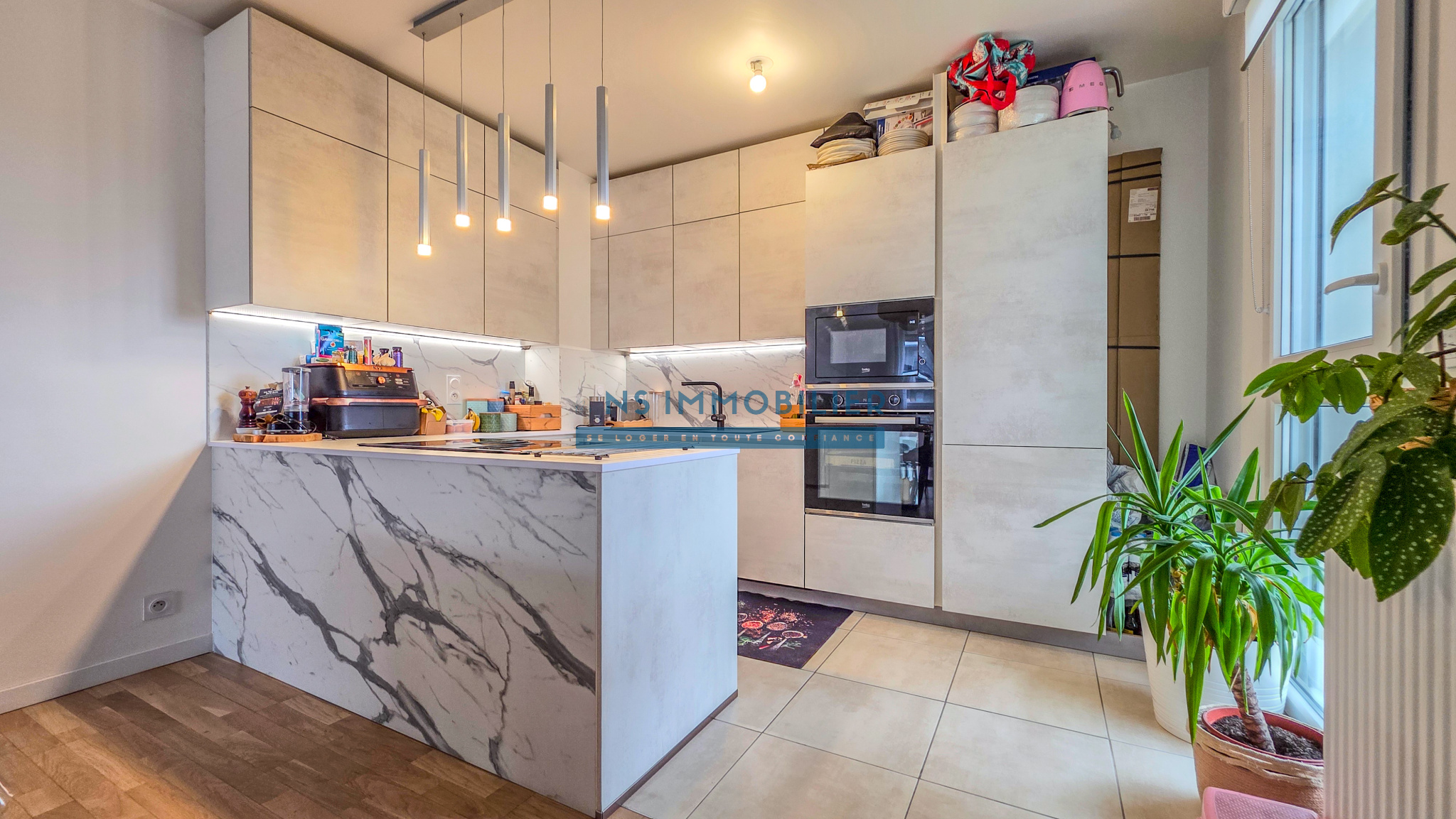Une entrée avec placard, un spacieux séjour avec une cuisine aménagée et entièrement équipée de haut de qualité donnant sur sa terrasse et son jardin exceptionnelle en Rooftop, trois chambres dont une suite parentale avec douche, une salle de bain et un WC séparé.